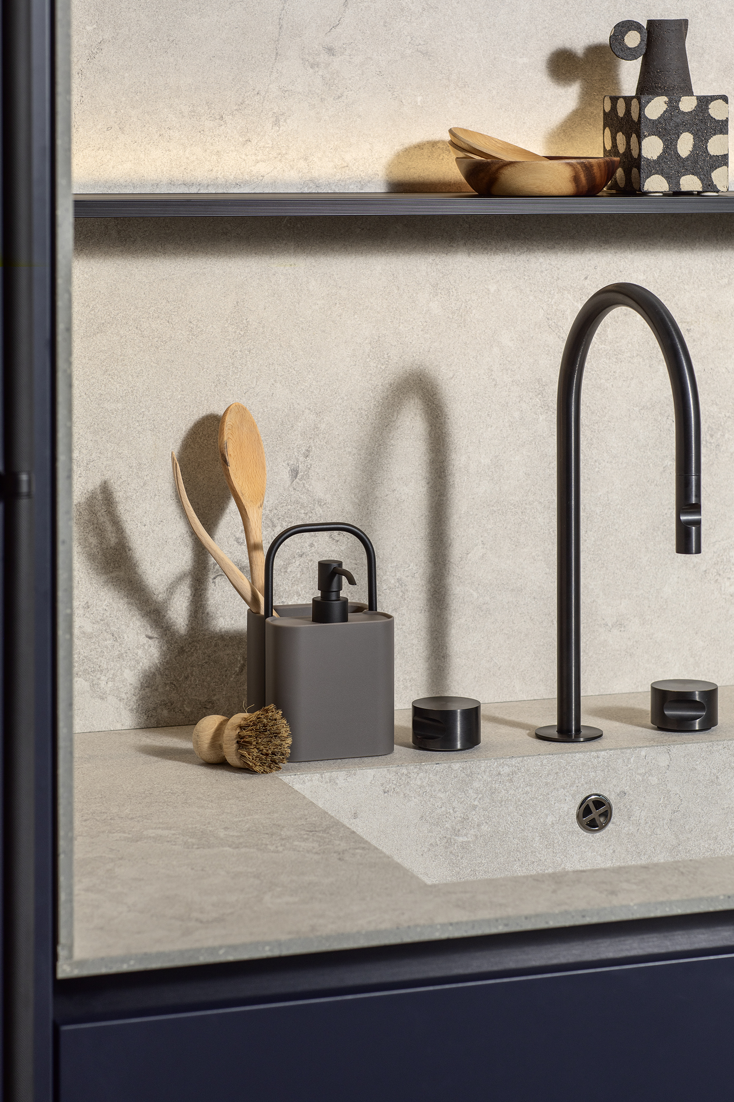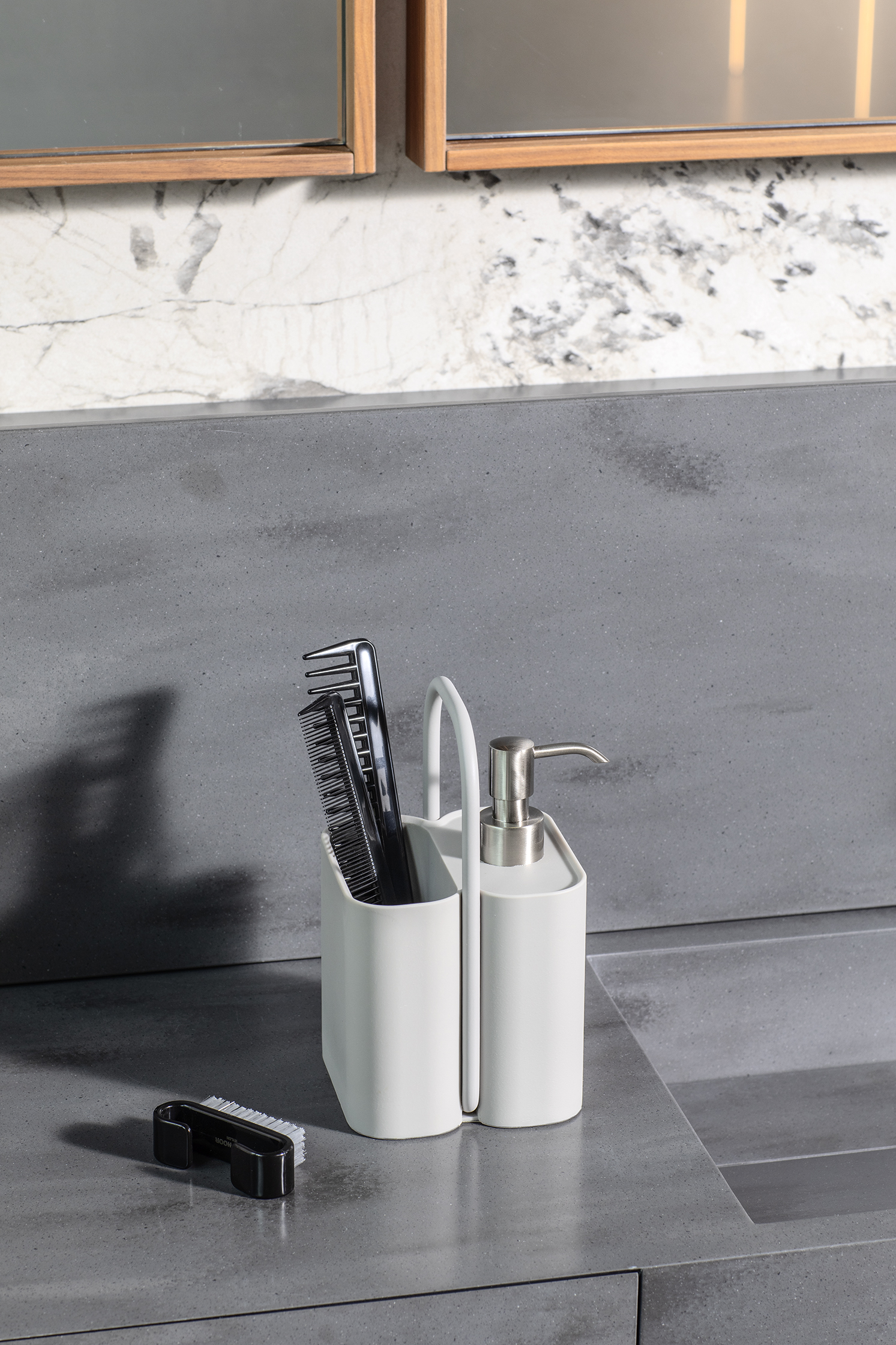 Dispenser di sapone o igienizzante con contenitore annesso. Capacità 250 ml. Fa parte della collezione Ply.