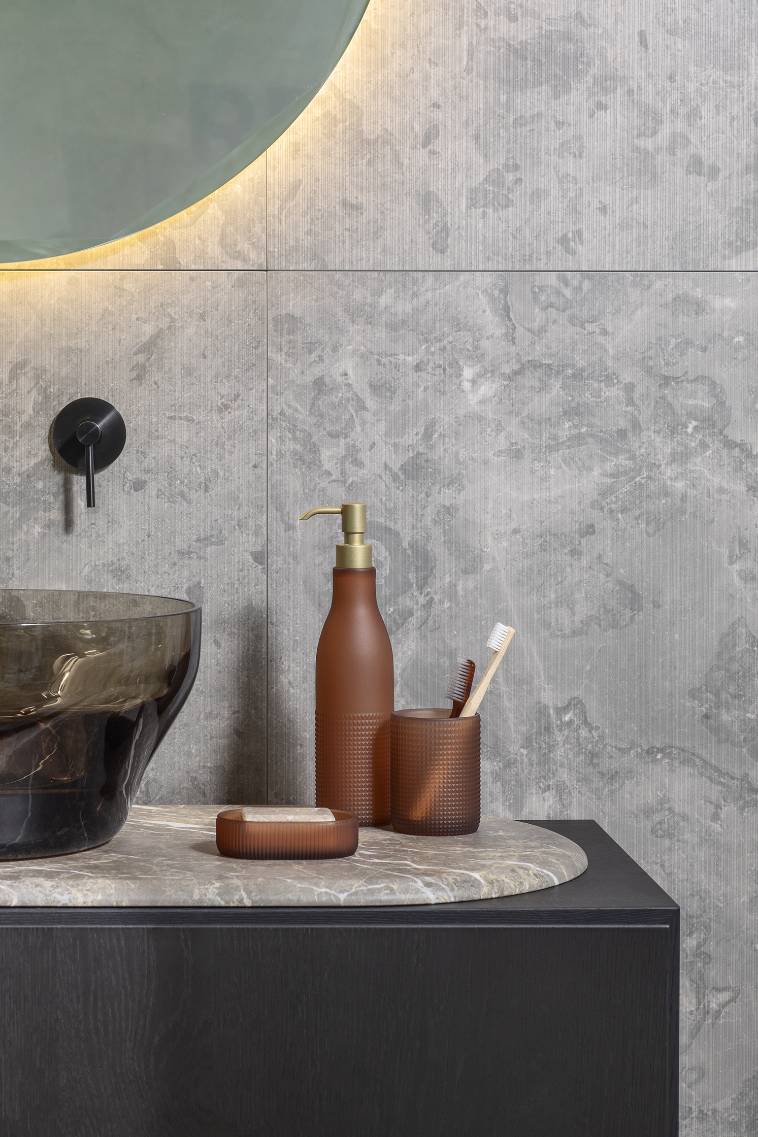 Dispenser da 500 ml contraddistinto dalla forma longilinea e da un’elegante texture diamantata sulla parte in gel che ne valorizza l’effetto soft del materiale. All’interno l’involucro è in plastica e la parte dispenser può essere in ottone cromato o nero opaco.